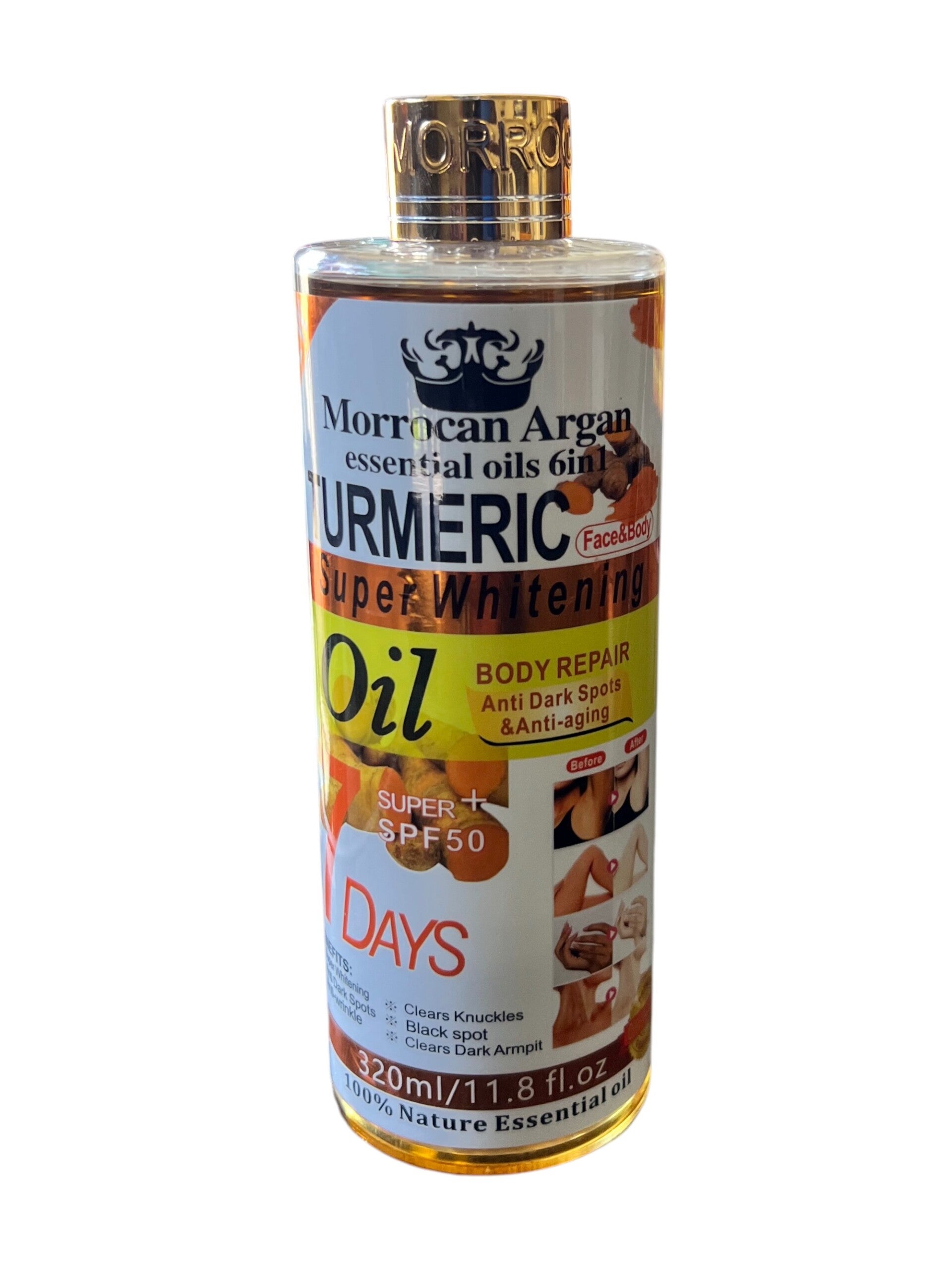 Turmeric Oil Super Whitening Oil is a body repair and skin-care oil made with turmeric and natural essential oils. It is designed to help brighten the skin, reduce the appearance of dark spots, and improve overall skin tone. The oil is lightweight, fast-absorbing, and suitable for use on the face and body. It is labeled Hydroquinone-free and contains SPF 50 for sun protection.